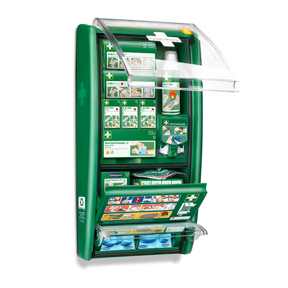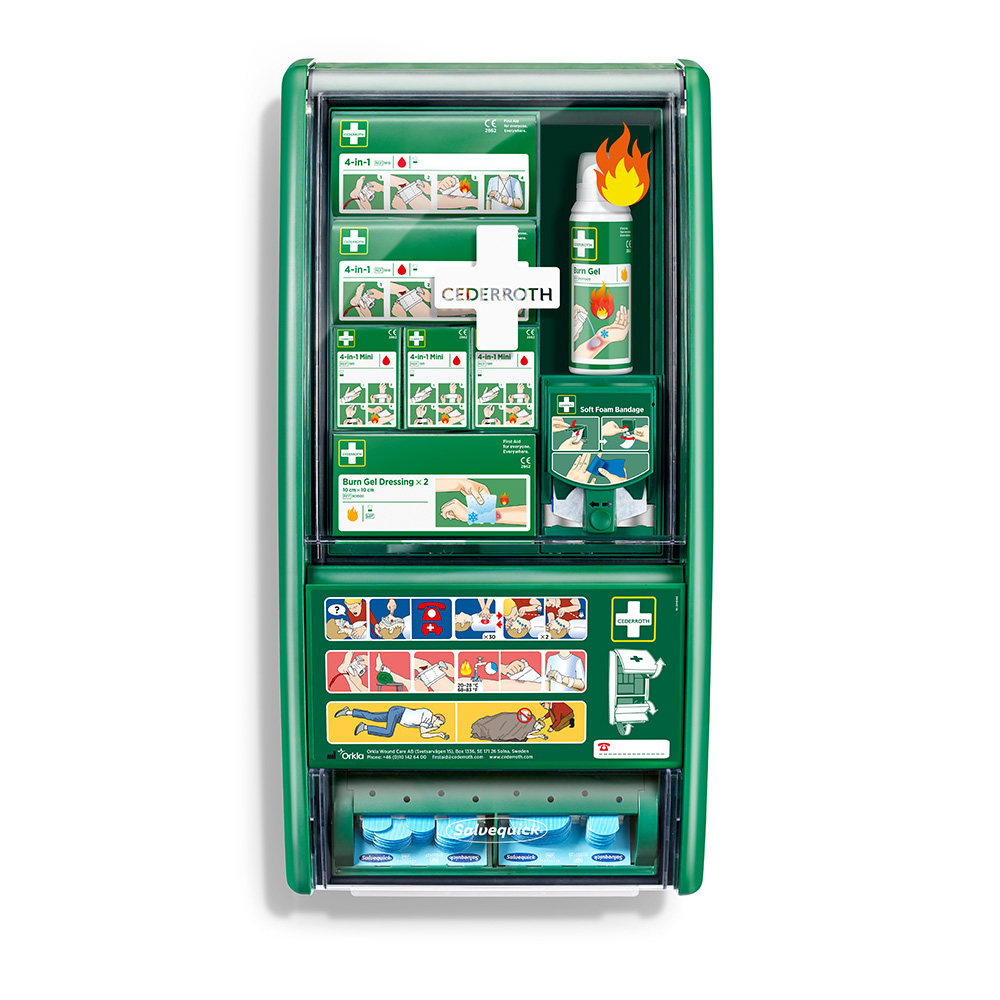Cederroth põletusravi esmaabijaam on mõeldud kõikidesse põletusriskidega töökeskkondadesse – näiteks kokkadele, elektrikutele, keevitajatele jne. Esmaabijaamas on suurim valik erinevaid põletusravivahendeid nagu näiteks põletusraviplaastrid, põletusgeel, põletusravisidemed. Haavade kinnikatmiseks on lisaks sinistele metallribaplaastritele ka pehme sinine vahtside, mis kleepub ainult iseendale ning läbi mille on võimalik põletust geeliga niisutada. Esmaabijaam on niiskuse ja tolmukindel ning plaastri- ja vahtisideme automaat ka varguskindel.